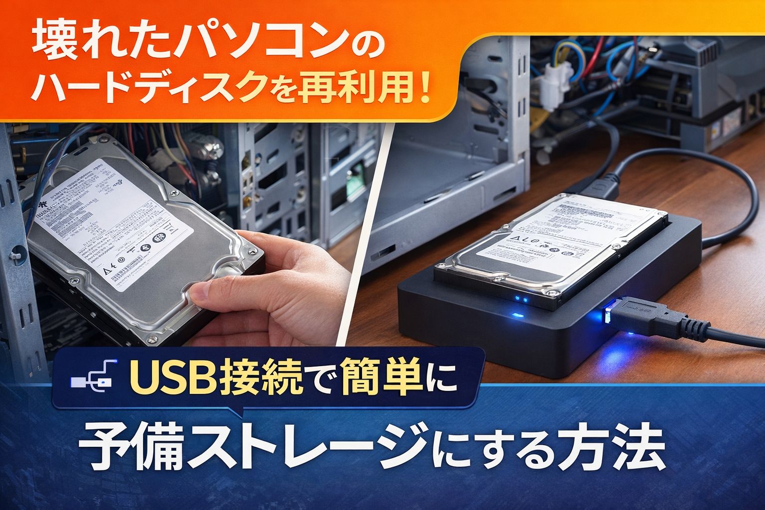 壊れたパソコンから取り出したハードディスクは、USB接続のケースや変換アダプタを使えば外付けストレージとして再利用できます。ただし古いHDDは劣化している可能性があるため、CrystalDiskInfoで状態を確認してから利用するのがおすすめです。